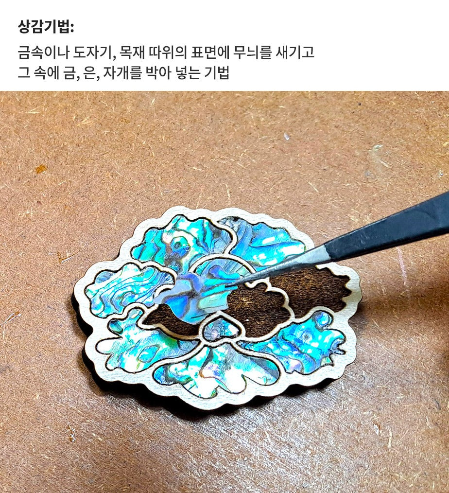 This product uses the Sanggam technique a traditional Korean method of engraving a surface and inlaying it with precious materials. To maintain the luster, wipe gently with a soft cloth. This brooch features a magnetic attachment to protect your delicate fabrics from pinholes. Please be mindful of the magnet's placement when wearing with thick materials. When not in use, place it on its dedicated stand to serve as a meaningful interior objet.
